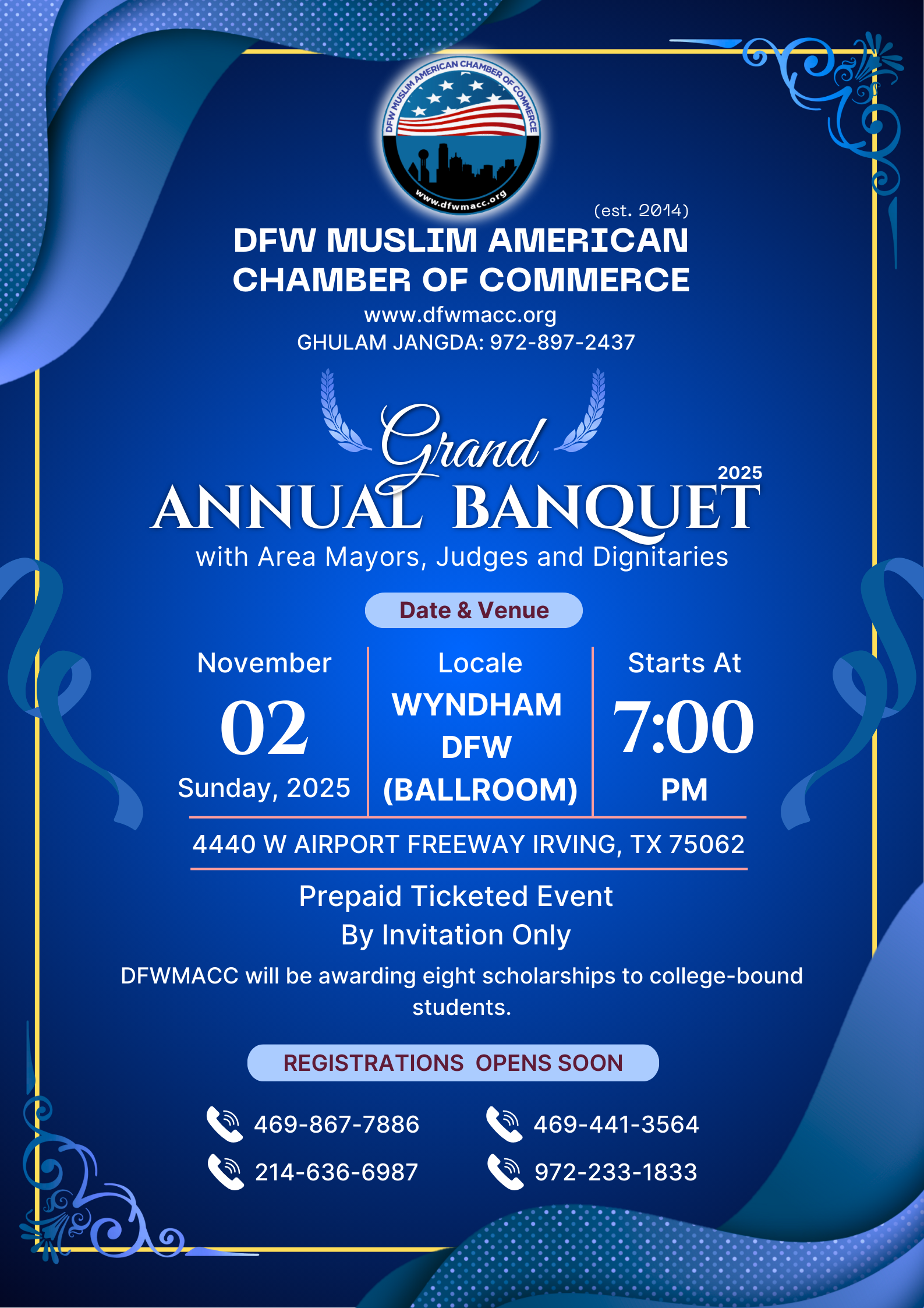 The DFW Muslim American Chamber of Commerce is proud to announce its Grand Annual Banquet 2025 โ an evening dedicated to celebrating community, leadership, and progress. ๐ Date: Sunday, November 2, 2025๐ Venue: